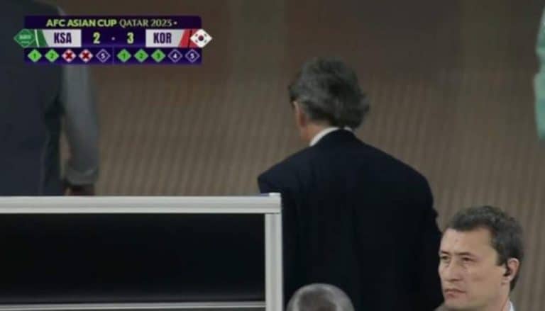 غادر روبرتو مانشيني مدرب السعودية مباراة الأخضر أمام كوريا الجنوبية قبل انتهائها في دور الـ16 من كأس آسيا 2023 بقطر.