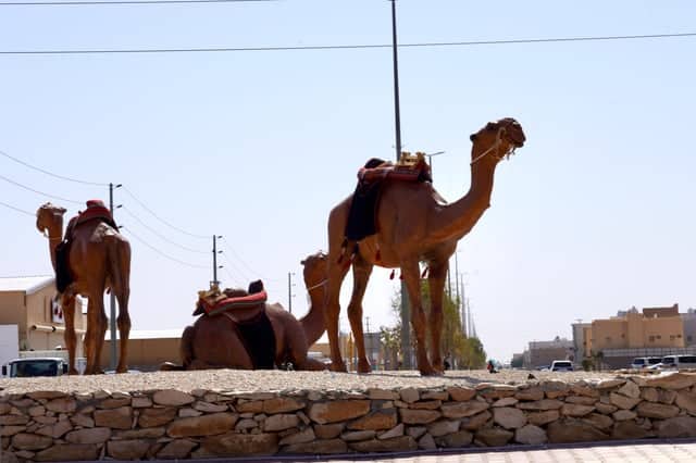 تمتد هذه التماثيل لارتفاع يصل إلى ثلاثة أمتار، مصنوعة من مادة الفايبر جلاس المتينة ومطلية باللون الأحمر الذي يرمز إلى أحد أشهر أنواع الإبل في المنطقة، مضيفة بُعدًا جماليًا وثقافيًا للموقع، وفقًا لـ”سبق”.