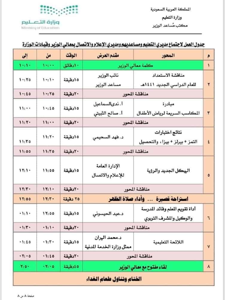ومن المقرر أن يناقش الاجتماع، الاستعدادات النهائية للوزارة وإدارات التعليم بجميع المناطق والمحافظات للعام الدراسي الجديد 1440 – 1441 هـ، وذلك بحضور الدكتور عبدالرحمن العاصمي؛ نائب وزير التعليم، والدكتور سعد آل فهيد؛ مساعد وزير التعليم.